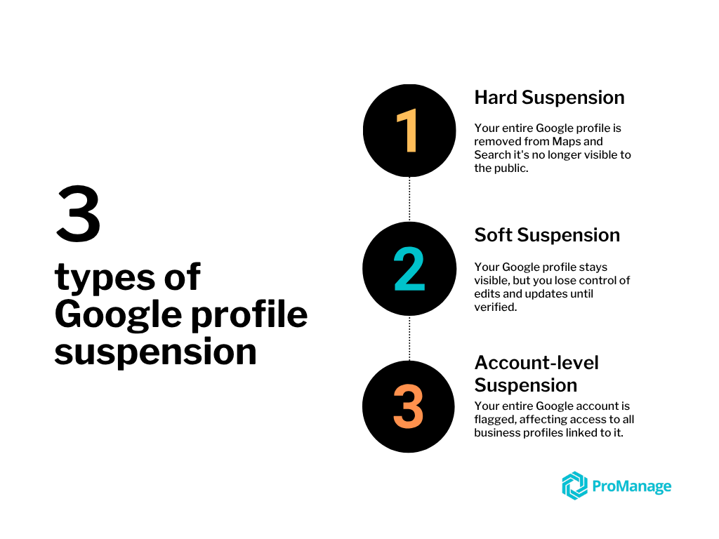 Google can enforce different levels of suspension on your profile or account, including soft suspensions, hard suspensions, and account level suspensions.